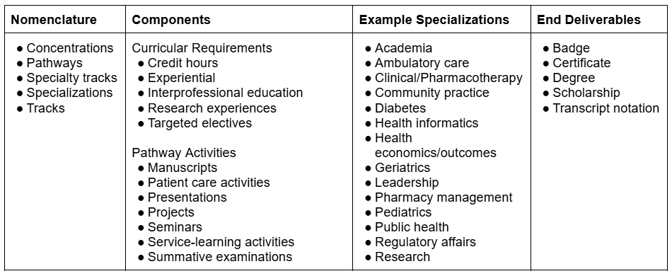 Currently, pathway offerings remain inconsistent. There is no standardization across colleges and schools of pharmacy regarding the nomenclature, structure, requirements, end deliverable, or specialization types offered.1,2 Table 1 highlights variances. This lack of clear consensus could create confusion for students, preceptors, and employers about what the student has accomplished, the rigor, and the value offered by having done so.